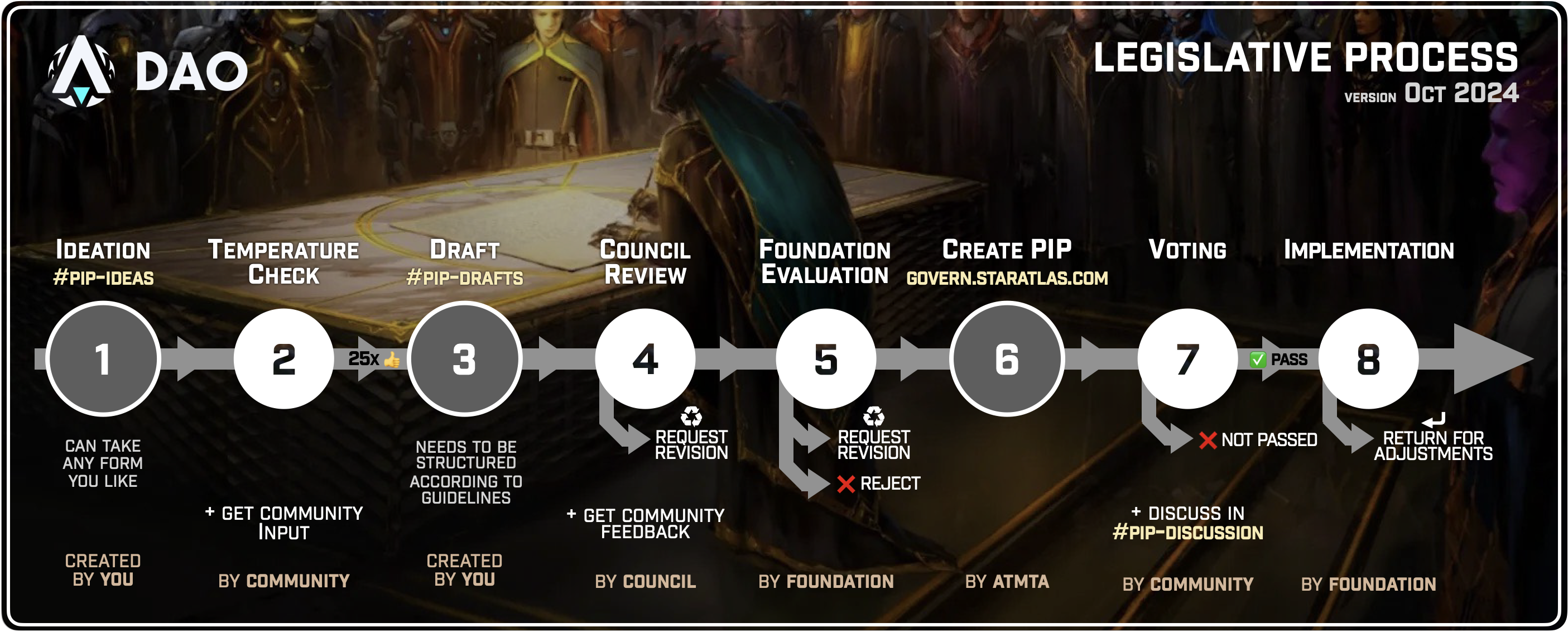 * The Council’s review process follows a [list of clear criteria](https://star-atlas-dao.gitbook.io/knowledge-base/governance/creating-a-proposal/pip-requirements). If the proposal requires revisions, the Council provides specific feedback, highlighting the formatting requirements and rules the draft must follow. This ensures the author knows exactly what to address.